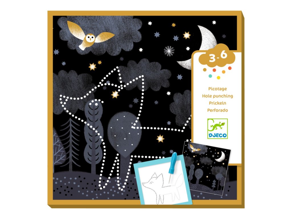 DJECO Montessori sada na tvorbu obrázkov pomocou dierkovania pre deti od 3 do 6 rokov vyrobená z FSC® papiera a kartónu rozvíjajúca jemnú motoriku predškolákov.