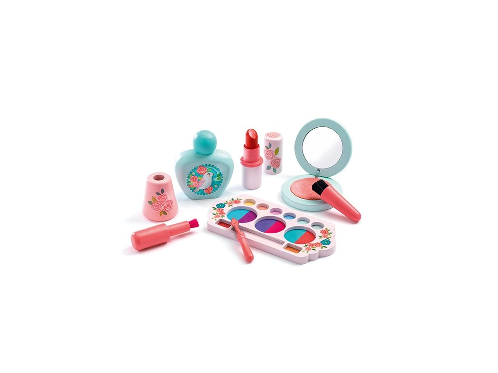 Drevená mejkapová sada na rolovú hru pre malé parádnice obsahuje šminky aj voňavku. Rúž, pudrenka so zrkadielkom, očné tiene, lak na nechty a voňavka, všetko je krásne ilustrované motívmi vtáčikov a kvetov. A všetko má svoje miesto v rovnako krásnej škatuli.