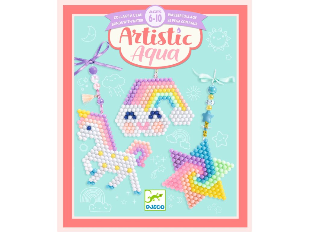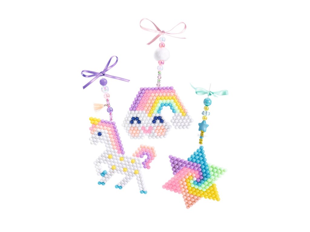 Malá sada Artistic korálok na zhotovenie 3 príveskov. Dieťa si poskladá prívesok z korálok pastelových farieb na špeciálnej podložke. Pod priehľadnú podložku položí predlohu (jednorožca, dúhový oblak alebo hviezdu), podľa ktorej poukladá korálky do priehlbiniek.