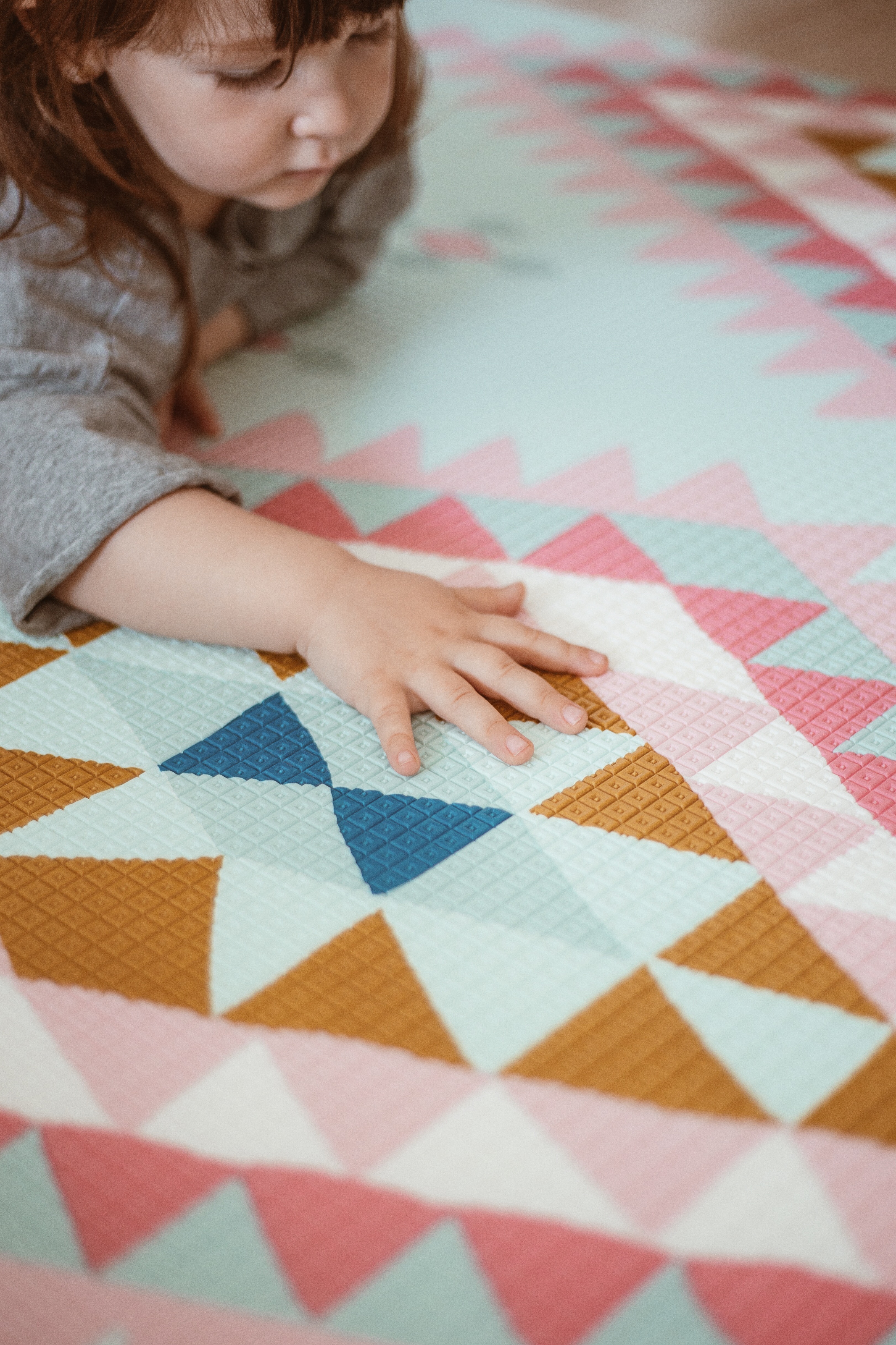 Priznám sa dlho som hladala vzor, ktorý by sme využili nielen v rannom veku, ale aj do budúcna. Nájsť niečo vkusné do izbičky aj pre staršie detičky nebolo vôbec však také ízy. Najprv sme mali skladaciu kvázi karimatkovú podložku so vzorom, ktorý som vždy predýchavala po vstupe do izbičky…Odmyslela som si teda ten nesúrodý vzor farieb a postavičiek a sústredila sa na pozitívnejšie stránky. Bola termo a ľahko sa skladala do harmoniky. Horšie bolo, že podložka sa šmýkala na podlahe a nedržala na mieste. Bolo to nielen nepraktické, ale miestami aj nebezpečné. Materiál bol tenší a dal sa jednoducho stlačením deformovať. Navyše do záhybov na skladanie sa ukladali všetky smietky. Skončila napokon zložená v aute, keďže nám ju nie je ľúto využívať na von, kde je viac-menej ideálna…až na ten vzor :)