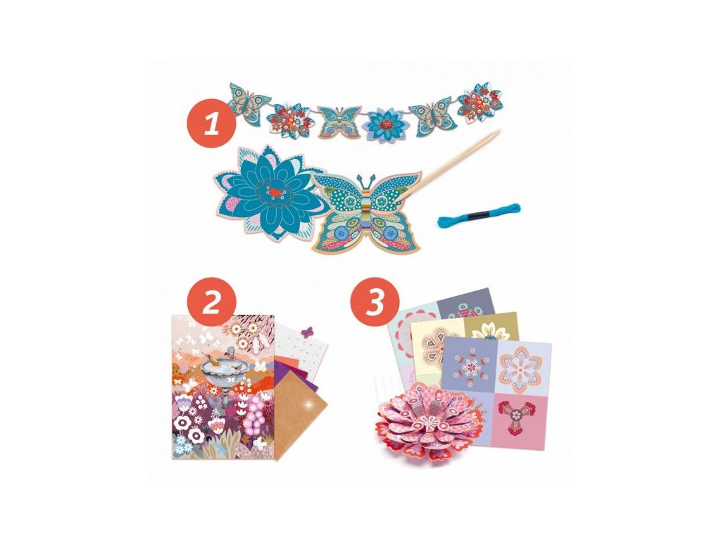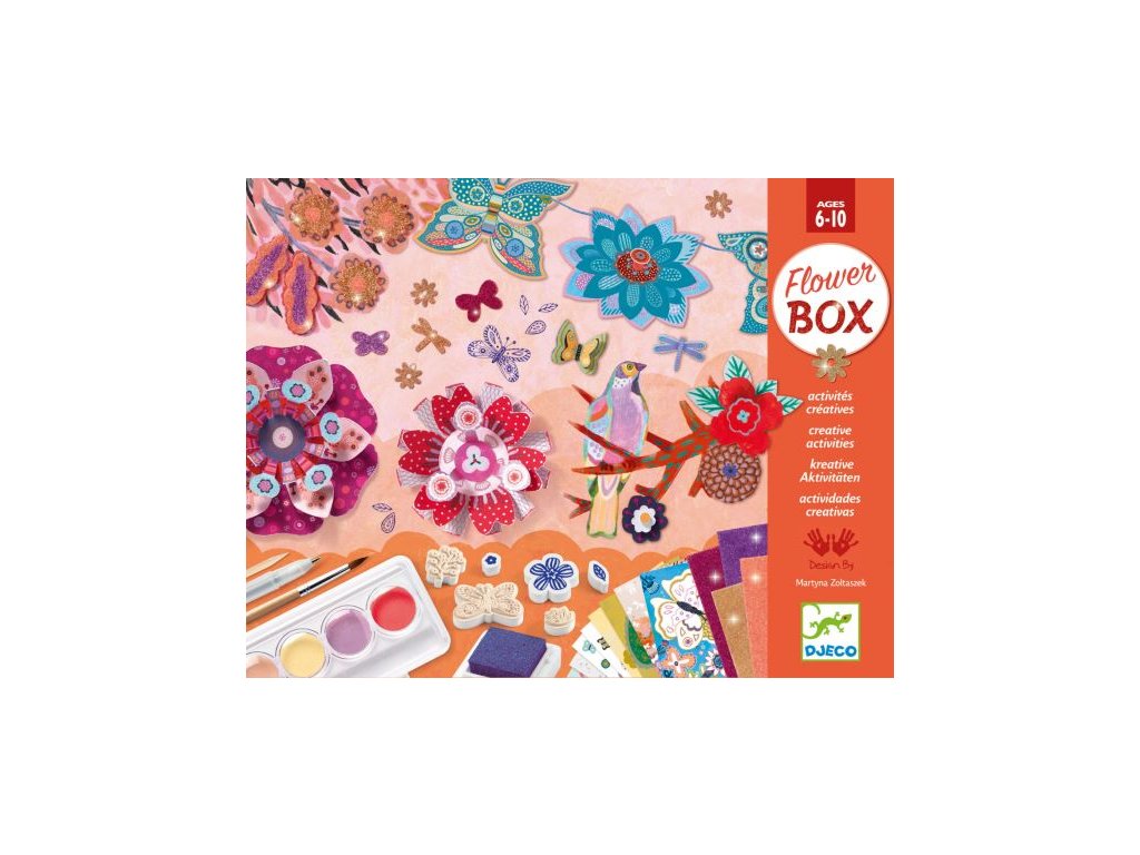 Sbírka 6 kreativních aktivit na téma romantické květinové zahrady. Velká kreativní sada - sbírka 6 kreativních činností, které spojuje téma květinové zahrady. Poskládáš si papírové 3D květiny, z tvarovaných vyškrabovaček si vyrobíš girlandu, třídílný rozevírací obraz zaplníš razítky a kresbami, zhotovíš si dvě 3D koláže, a dotvoříš další dva obrázky – jeden třpytkami a druhý vodovými barvami. Sada obsahuje vše potřebné.Koláže, vyškrabávání, razítka, 3D květiny a mnoho jiného. Obsah: 9x arch s částmi na výrobu 3D květin, 1x třídílný rozevírací obraz, 13x razítka, 1x poduška na razítka, 1x pero, 8x tvarované vyškrabovačky na girlandu, 1x dřevěná škrabka, 1x šňůra na girlandu, 2x obrázek prvky na koláž, 1x obrázek na dobarvení vodovkami, 1x vodové barvy, 1x štětec, 1x obrázek na dotvoření třpytkami, 4x arch třpytkového papíru, 1x arch s oboustranně lepícími lepky, 2x arch s oboustranně lepícími čtverečky.